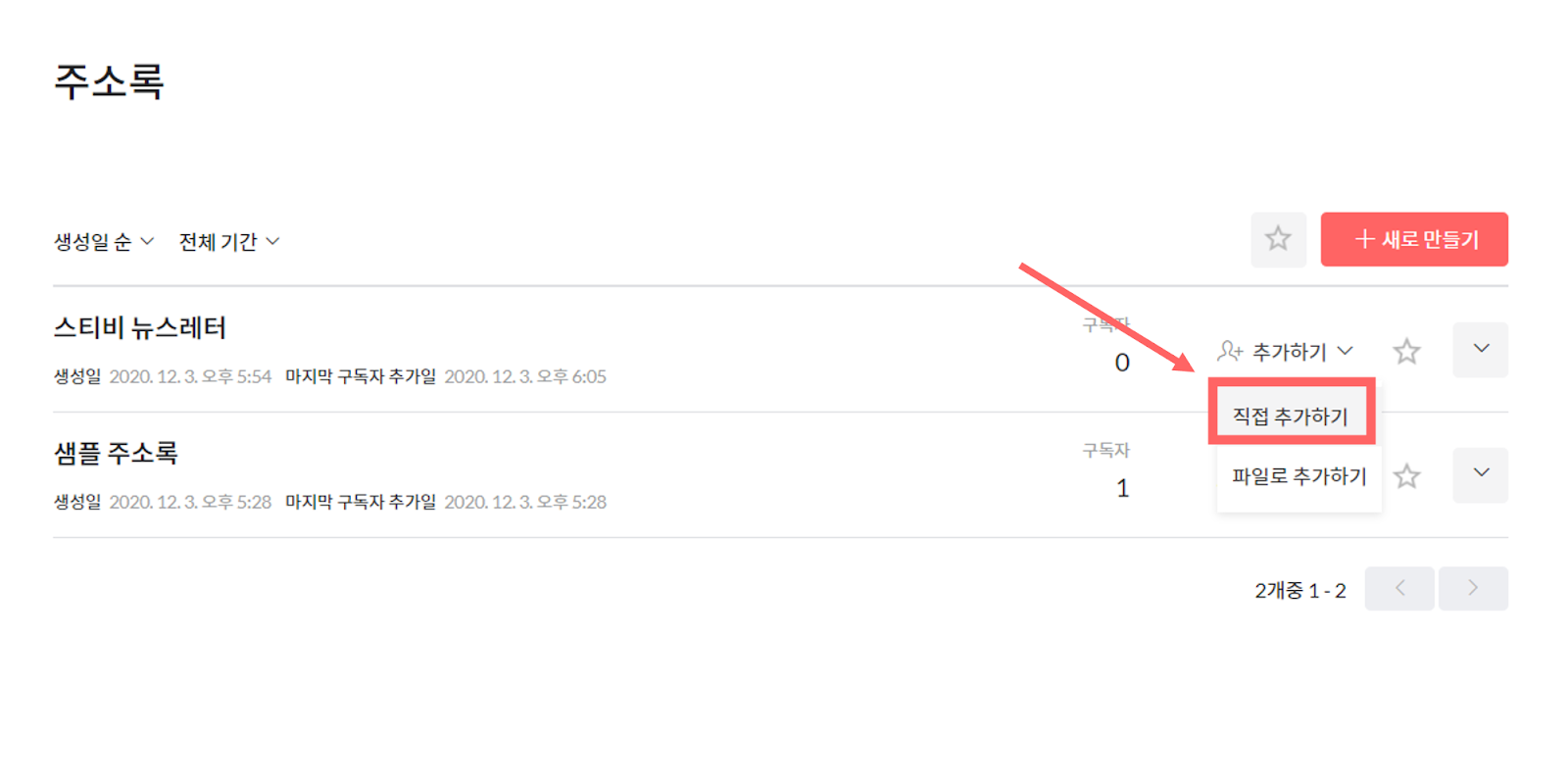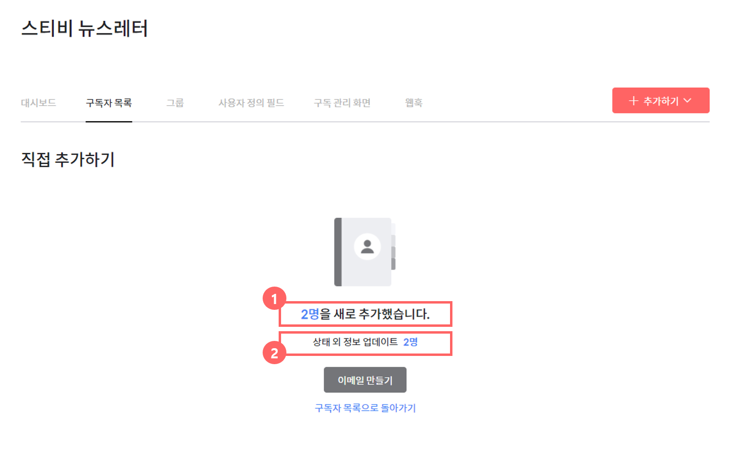 주소록에 구독자를 추가하는 방법에는, 구독자의 이메일 주소를 직접 입력하여 추가하는 방식과 파일을 업로드하여 추가하는 방식이 있습니다.