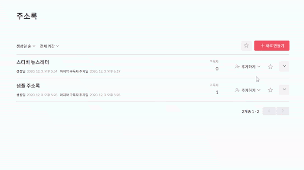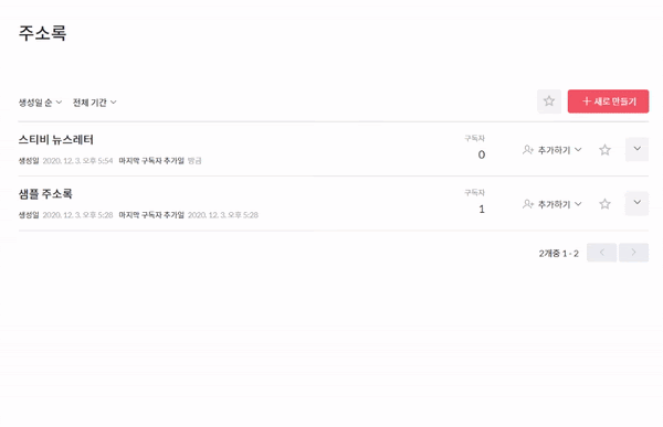 주소록은 이메일 발송 대상이 되는 구독자를 추가하여 관리하는 단위입니다. 주소록에 구독자를 추가한 뒤, 이메일을 만들 때 주소록을 선택하면, 선택한 주소록에 있는 구독자들에게 이메일이 발송됩니다.