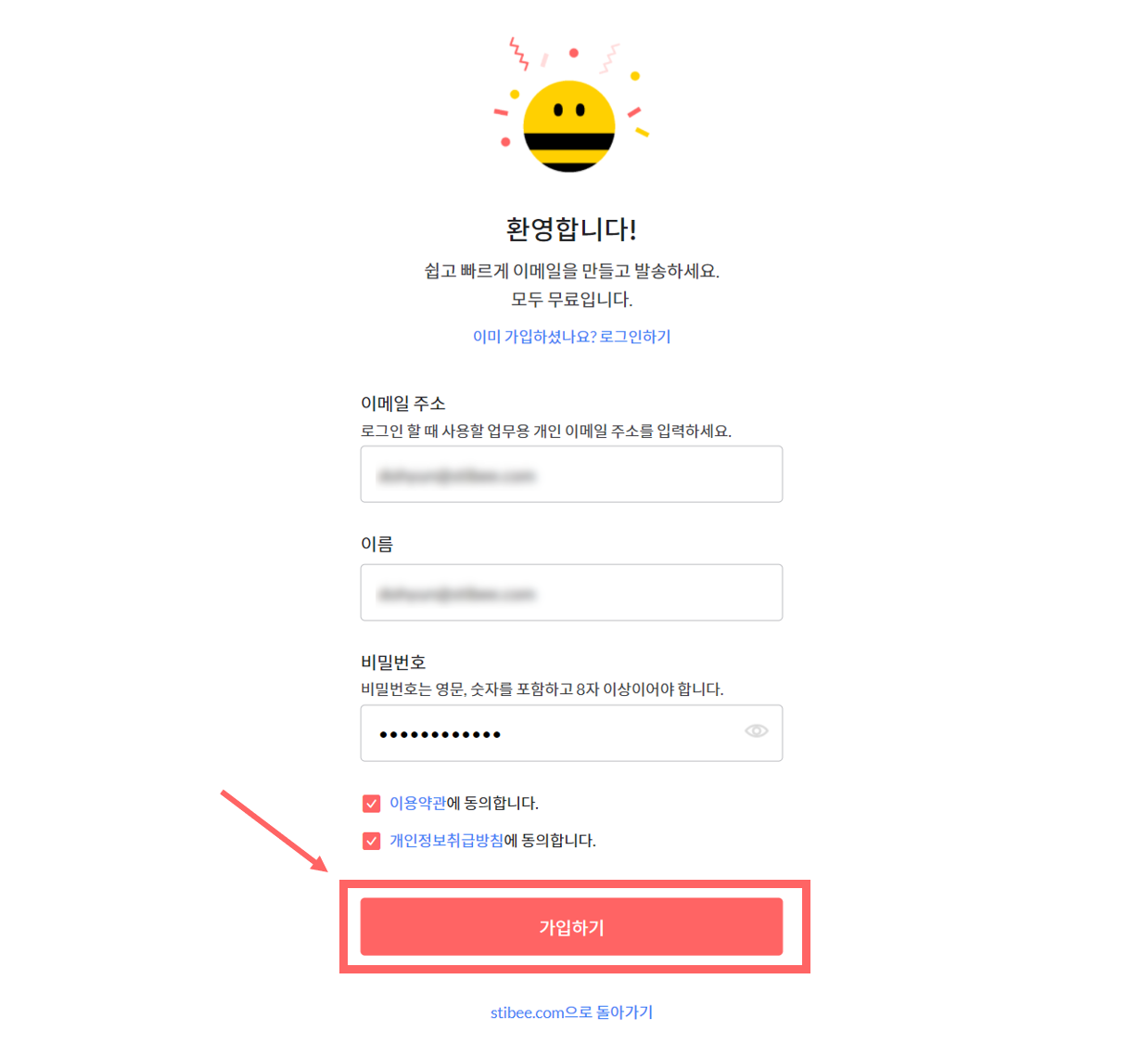 이메일 주소와 비밀번호를 입력하고, 이용약관과 개인정보 수집∙이용 및 취급위탁 내용을 확인한 뒤, 가입하기를 클릭해주세요.