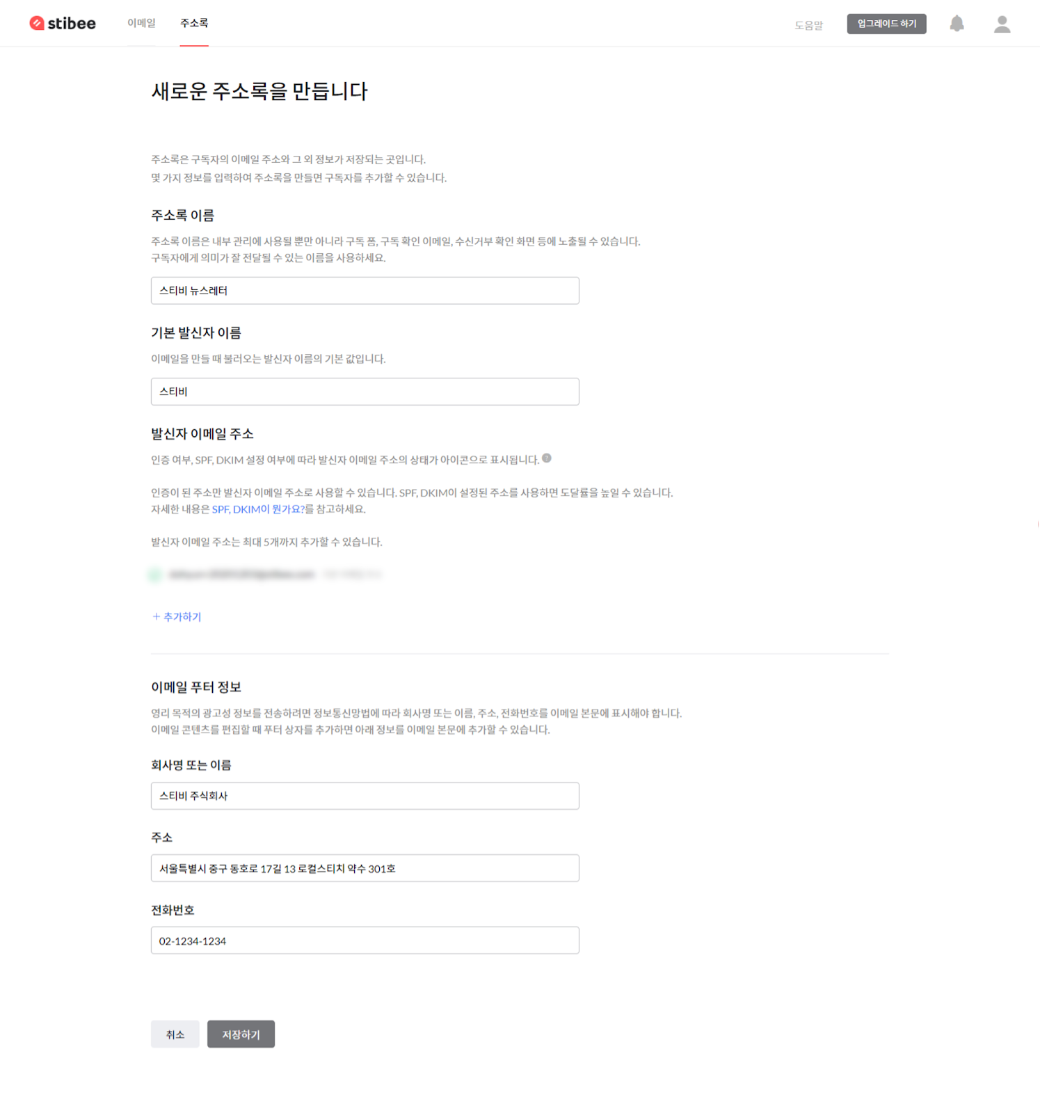 주소록 생성 화면에서 주소록 이름, 기본 발신자 이름, 발신자 이메일 주소, 이메일 푸터 정보를 입력합니다