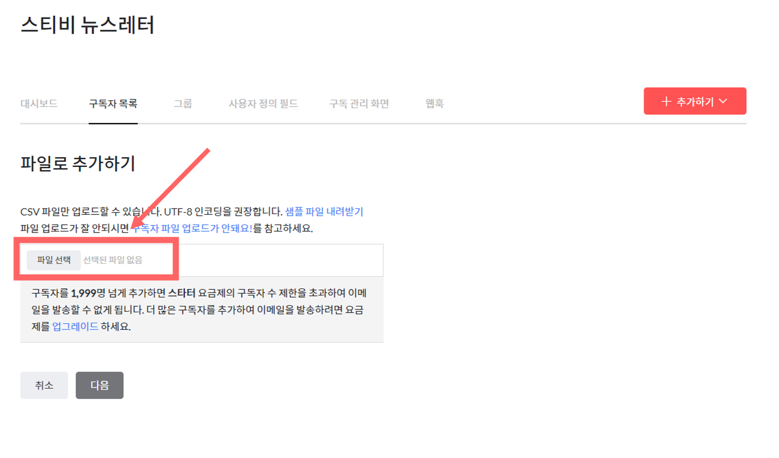 파일 선택을 클릭하여 구독자 정보가 포함된 CSV 파일을 선택하고 다음을 클릭합니다.