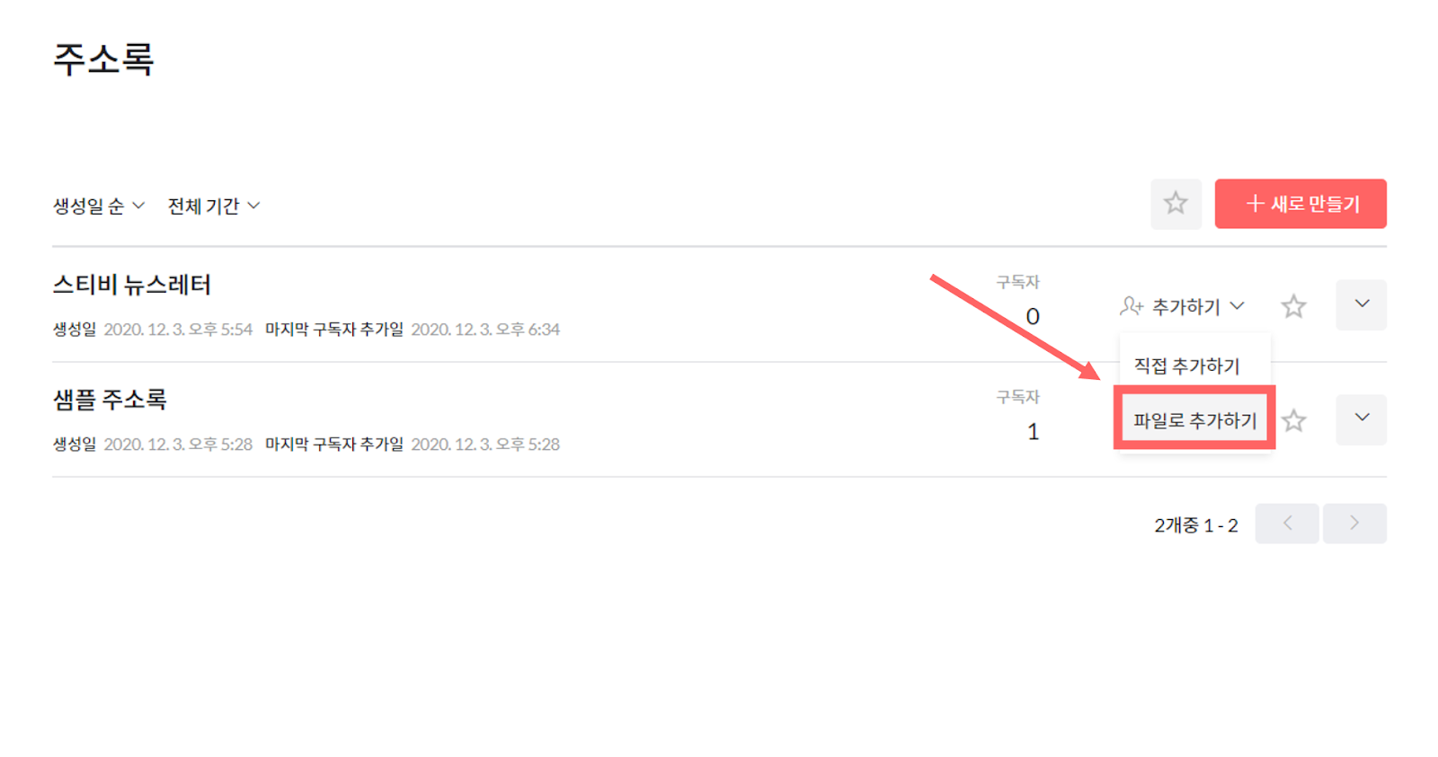 구독자를 CSV 파일로 추가할 수 있습니다. 주소록 목록에서 추가하기의 파일로 추가하기를 클릭합니다.