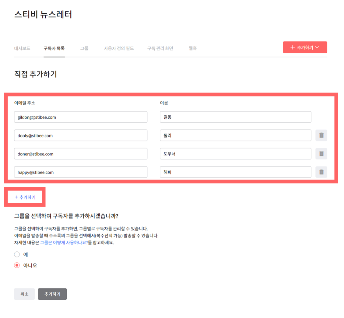 추가하고자 하는 구독자의 이메일 주소와 이름을 입력합니다. +를 클릭하면 한 번에 여러 구독자를 추가할 수 있습니다.