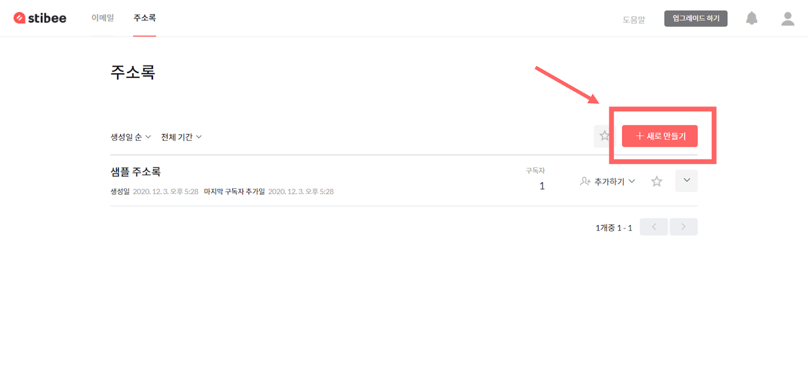 메인 대시보드 상단 메뉴에서 주소록을 클릭하여 주소록 목록으로 이동한 뒤, 새로 만들기를 클릭하세요.