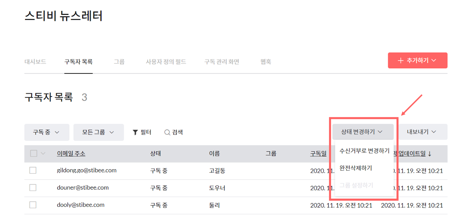 구독자 목록에서 구독자 상태변경을 통해 구독자의 상태를 변경할 수 있습니다. 예를 들어 구독자를 수신거부 상태로 변경하거나 완전삭제할 수 있습니다.