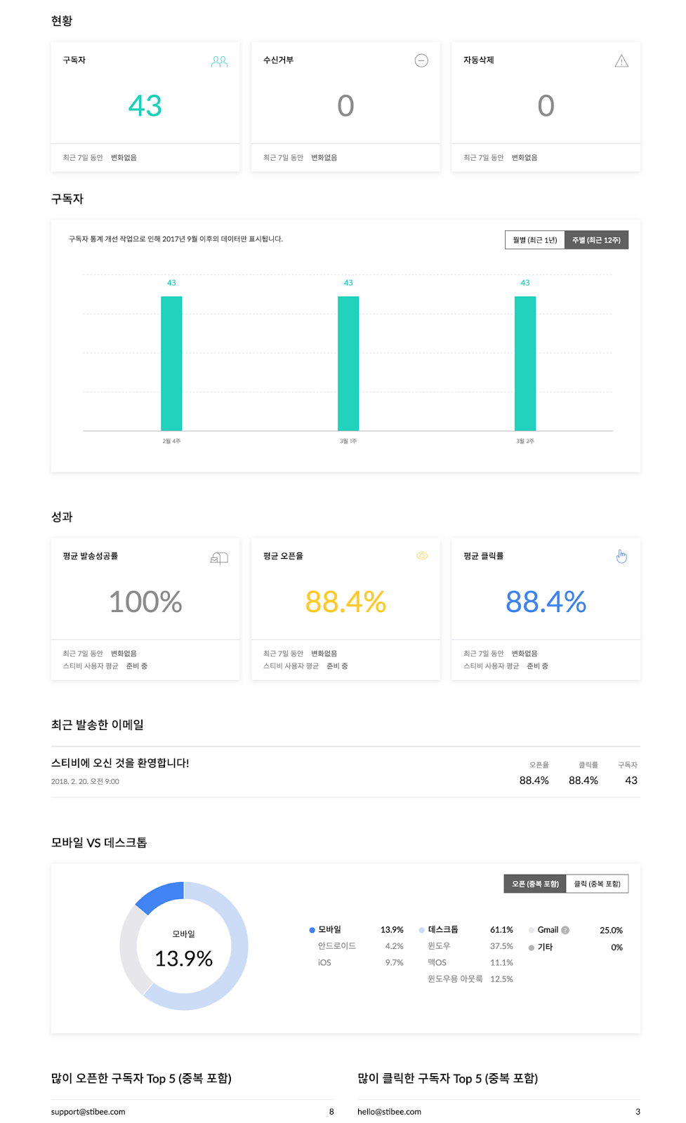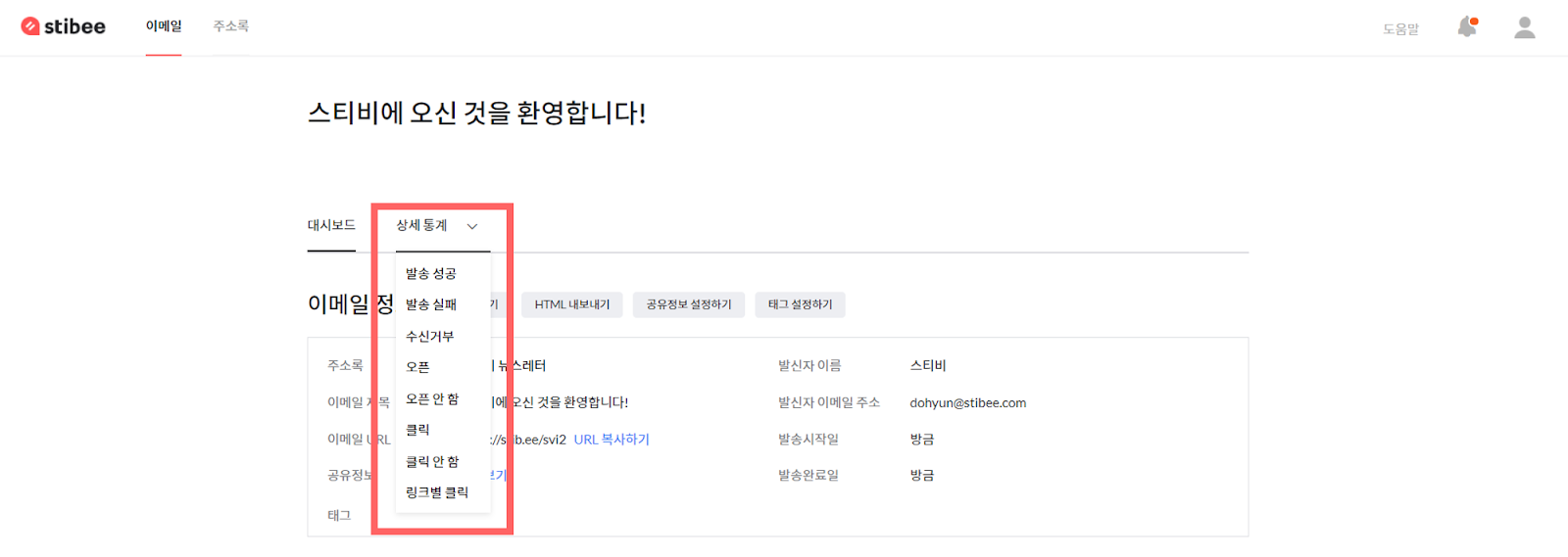 이메일을 발송한 뒤, 이메일 대시보드에서 발송 결과를 한눈에 볼 수 있습니다.