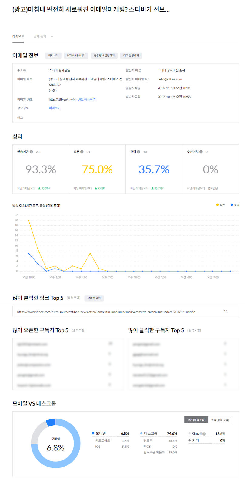 이메일 목록에서 통계를 확인할 이메일을 클릭하여 이메일 대시보드로 이동합니다. 대시보드에서는 이메일의 발송정보와 성과, 모바일과 데스크톱에서의 오픈율, 클릭률 등을 확인할 수 있습니다.