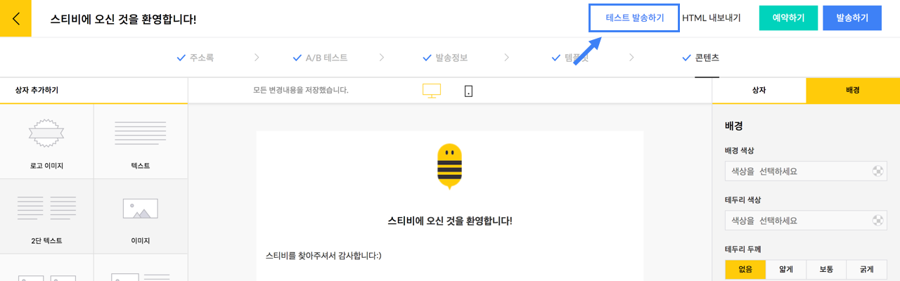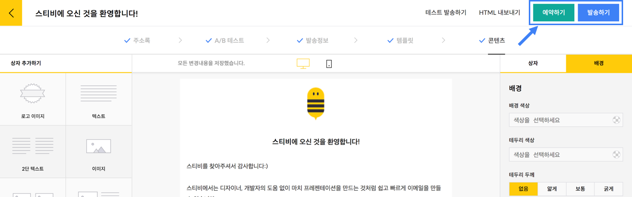 이메일 콘텐츠 제작을 완료했다면, 예약하기 또는 발송하기 버튼을 클릭하여 이메일을 발송할 수 있습니다.