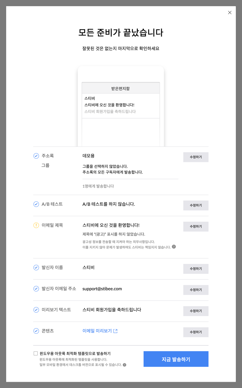 주소록을 제대로 선택했는지, 이메일 제목을 제대로 입력했는지 등을 마지막까지 꼭 확인하세요.