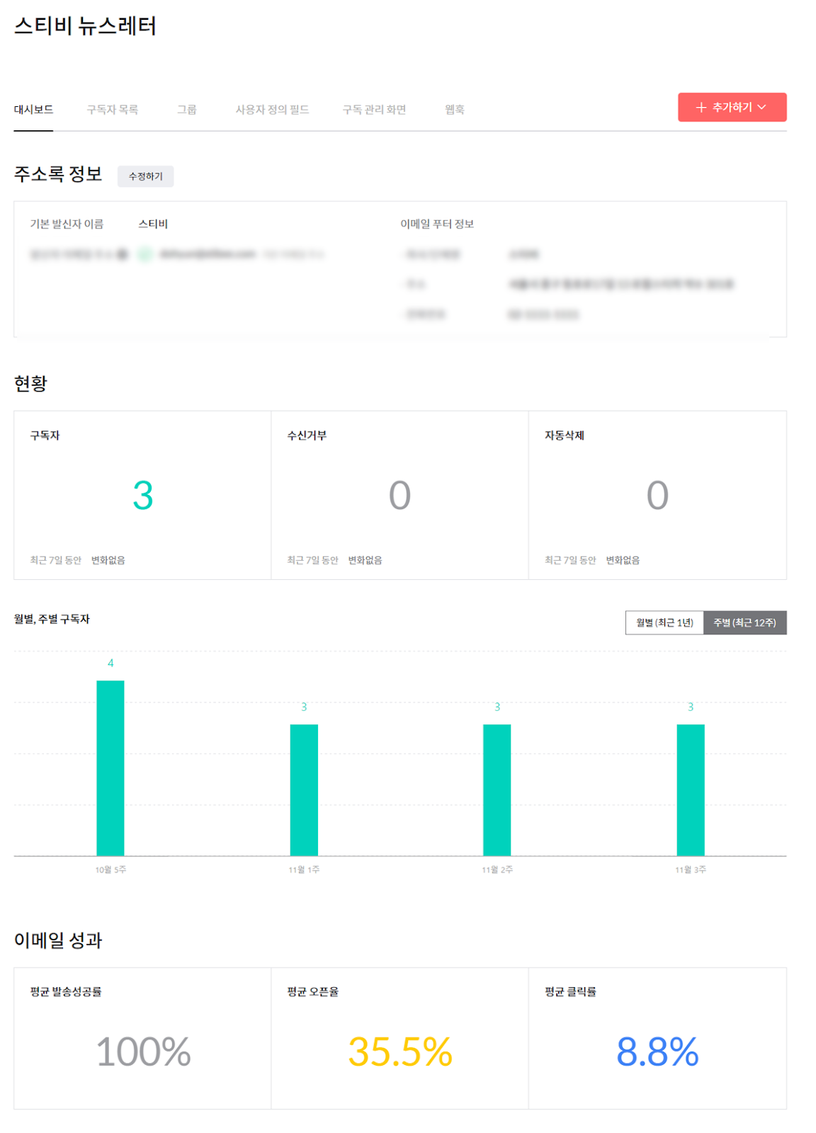 주소록 목록에서 통계를 확인할 주소록을 클릭하여 주소록 대시보드로 이동합니다. 주소록 대시보드에서는 주소록 현황과 성과, 최근 발송한 이메일, 구독자 현황 등을 확인할 수 있습니다.