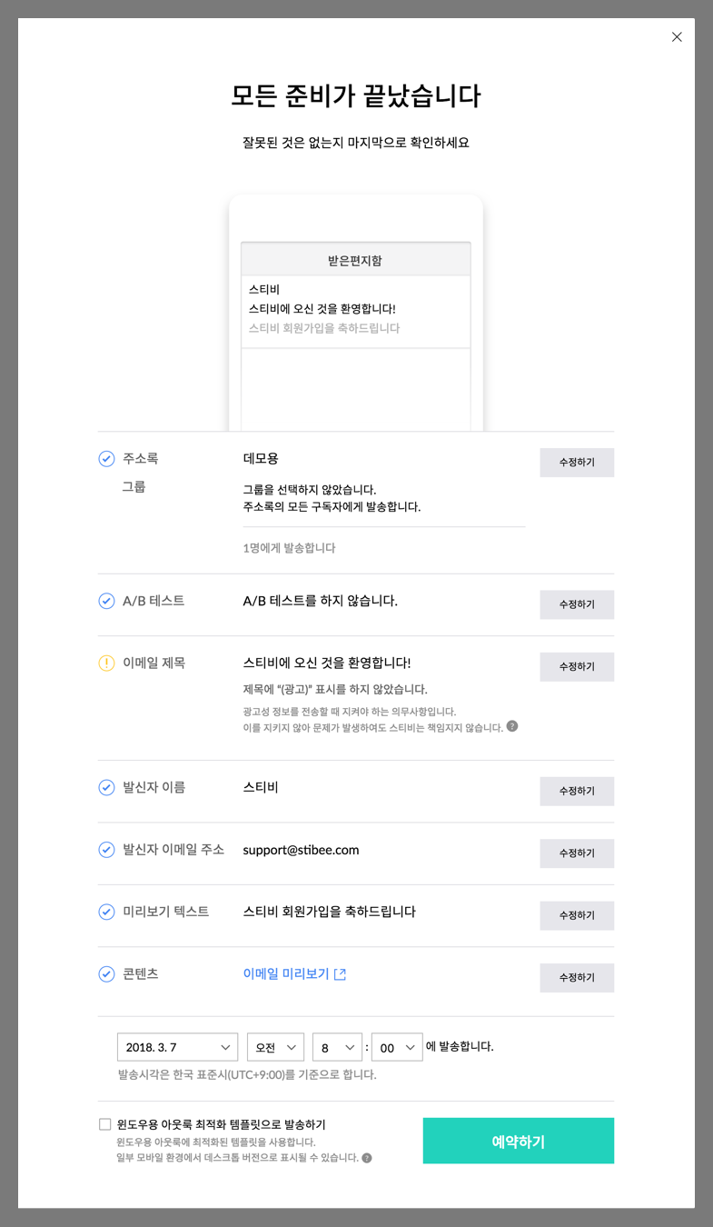 예약하기는 원하는 날짜와 시간을 설정하여 이메일 발송을 예약하는 기능입니다. 예약된 이메일은 이메일이 실제로 발송되기 전까지 수정할 수 있습니다.