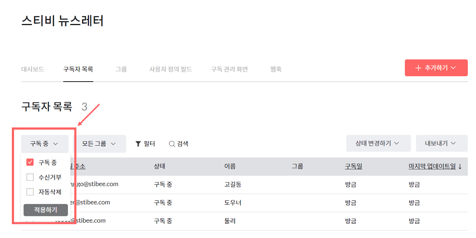 상단 메뉴의 구독자 목록을 클릭하고 구독 상태 필터를 클릭하면 구독중, 수신거부, 자동삭제 등 구독 상태 별로 체크하여 확인할 수 있습니다.